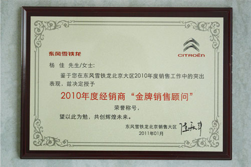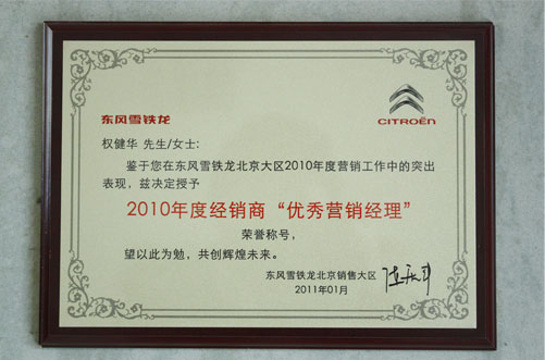 集团雪铁龙店: “2010年度经销商销售进步奖”