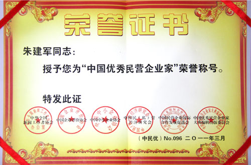 为了切实研究探讨和解决民营企业发展所面临的困难和问题,推进全国民营经济沿着两个健康的方向科学发展。3月26日,由中华全国新闻工作者协会、中国企业评价协会、中国中小企业协会、中国民(私)营经济研究会、中国民营企业国际合作发展促进会等单位联合举办的中国优秀民营企业家大会在人民大会堂隆重举行,大会对2010年度优秀民营企业和优秀民营企业家举行了隆重的表彰仪式,集团董事长兼总裁朱建军被授予“中国优秀民营企业家”、集团被授予“中国优秀民营企业”荣誉称号。