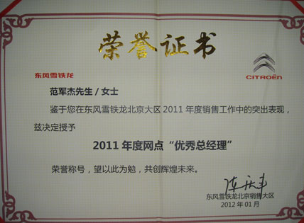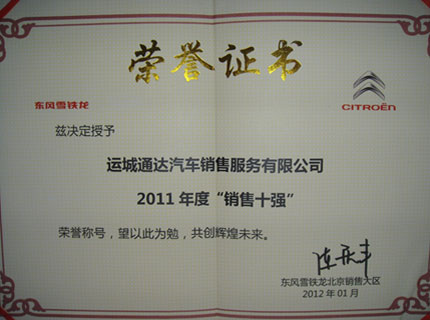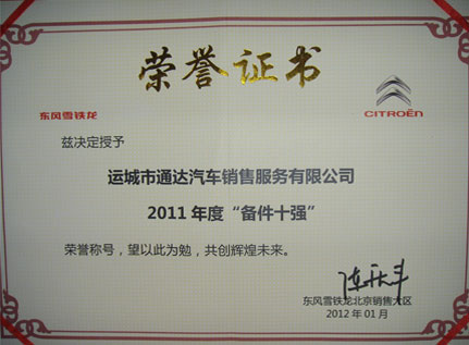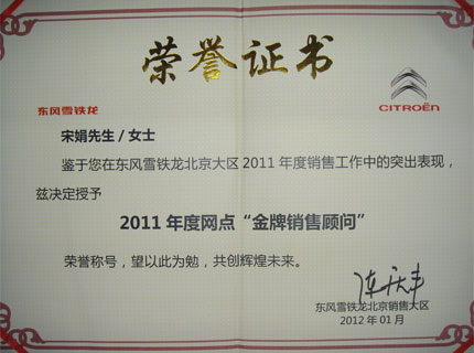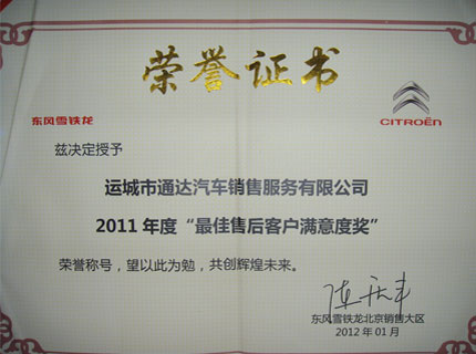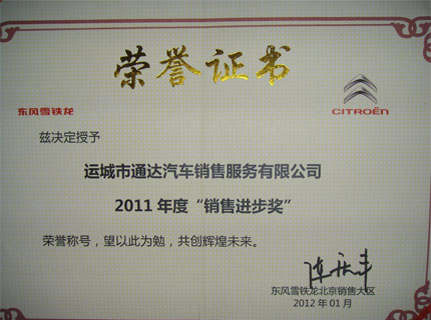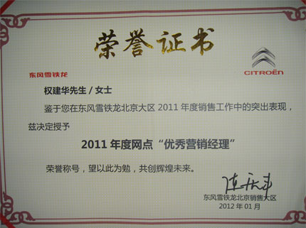 1月9日—11日,集团汽贸执行总经理王红斌、雪铁龙4S店经理范军杰在厦门参加了由东风雪铁龙公司举办的“2011年度东风雪铁龙北京大区总结表彰大会”,会上,厂方领导对我公司雪铁龙店2011年销售业绩增长47.86%,勇夺山西区域进货、销售双冠王表示祝贺,并授予我集团雪铁龙店2011年度“销售十强”、“备件十强”、“销售进步奖”、“最佳售后客户满意度奖”、“优秀总经理”、“优秀营销经理”、“金牌销售顾问”等荣誉。