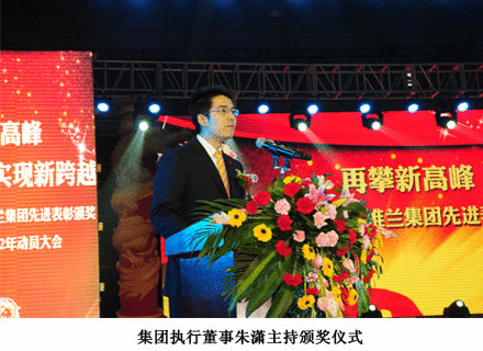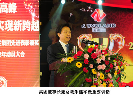 大会由集团执行董事朱潇主持,会议首先通过视频——《辉煌2011》,展示回顾了集团2011年度在全面贯彻落实集团转型跨越大发展战略中取得的辉煌成就,集团董事长兼总裁朱建军做了题为《再攀新高峰、实现新突破,全面夺取集团新一轮跨越发展的伟大胜利》的工作报告,报告中回顾了2011年集团和各经营公司所取得的成绩和荣誉,深刻剖析工作中存在的不足和问题,提出了集团2012年的战略总目标是:围绕集团转型跨越大发展战略,再攀新高峰,实现新突破,全面夺取集团新一轮跨越发展的伟大胜利。报告要求, 2012年,全员要把新一轮跨越发展战略思想贯穿于2012年全年的各项工作当中来,增强不进则退的危机意识,把握发展机遇,不断完善和创新激励机制,不断创新、发展和提升企业文化发展战略,在全员职业化提升上下功夫,健全和完善制度化管理体系和信息化管理平台建设,持续提升全员服务水平,坚持“创新求变”的创新工作理念,要把“变”作为一种常态,作为一种精神,把“变”彻底融入到公司转型跨越大发展战略中去,打破常规,主动求“变”,导入新思想、新理念、新制度、新文化,打造新团队,实现战略、文化、服务、制度、品牌、营销、人力资源、财务管理、生产研发与制造方面的全面创新与发展。